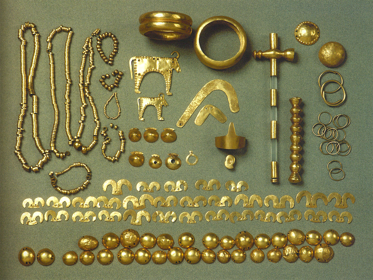 Because so much gold was found in only a few gravesites (see photo above), and none in others, experts believe this is evidence of an elite class of neolithic chiefs in this culture. But David Anthony notes that there is no evidence that elite individuals or families lived any more richly in their private lives than ordinary people. "[D]isplays of opulence [in the gravesites] still surprise and puzzle archaeologists, because there was no equivalent distinction in private houses" (Lost World, p.29). The chief who wore the gold at public events went home to an ordinary house, says Anthony.