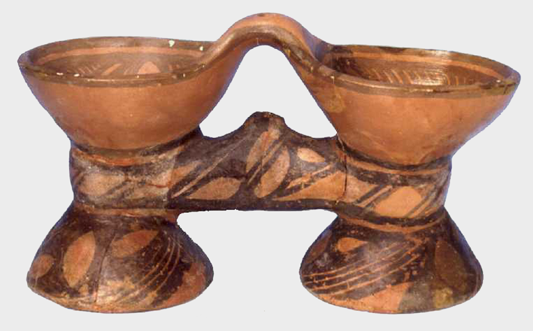 The repertory ... included goblets, globular vessels, biconical vessels, bowls, jars, pear-shaped (pyriform) vessels, tureens, vessels and cups on pedestals, pedestaled support vessels, handled lids, and others. ... Innovative shapes included numerous vessels with bulging and flattened bodies, crater-shaped tureens with wide-open mouths, ... and goblets. (Lazarovici, Lost World, p.131)